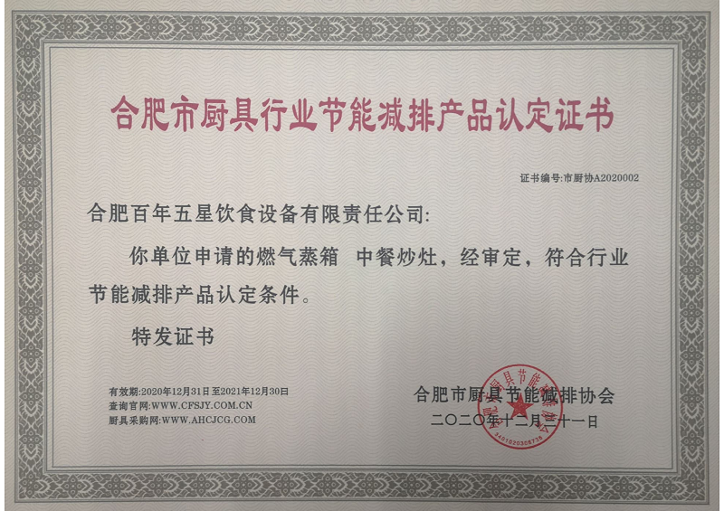 合肥市厨具行业节能减排产品认定证书-百年五星