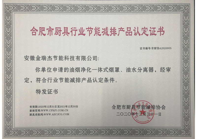 合肥市厨具行业节能减排产品认定证书-金瑞杰